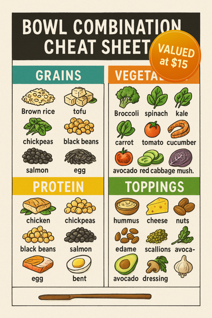 Build the perfect energizing bowl every time! This easy-to-follow guide shows you exactly how to mix proteins, grains, veggies, and healthy fats for endless, nutritious meal combinations — ready in minutes.